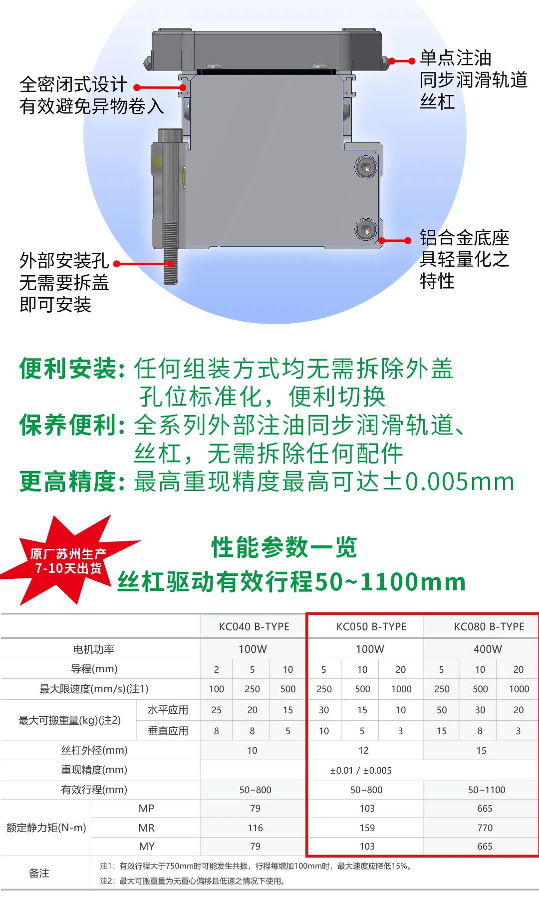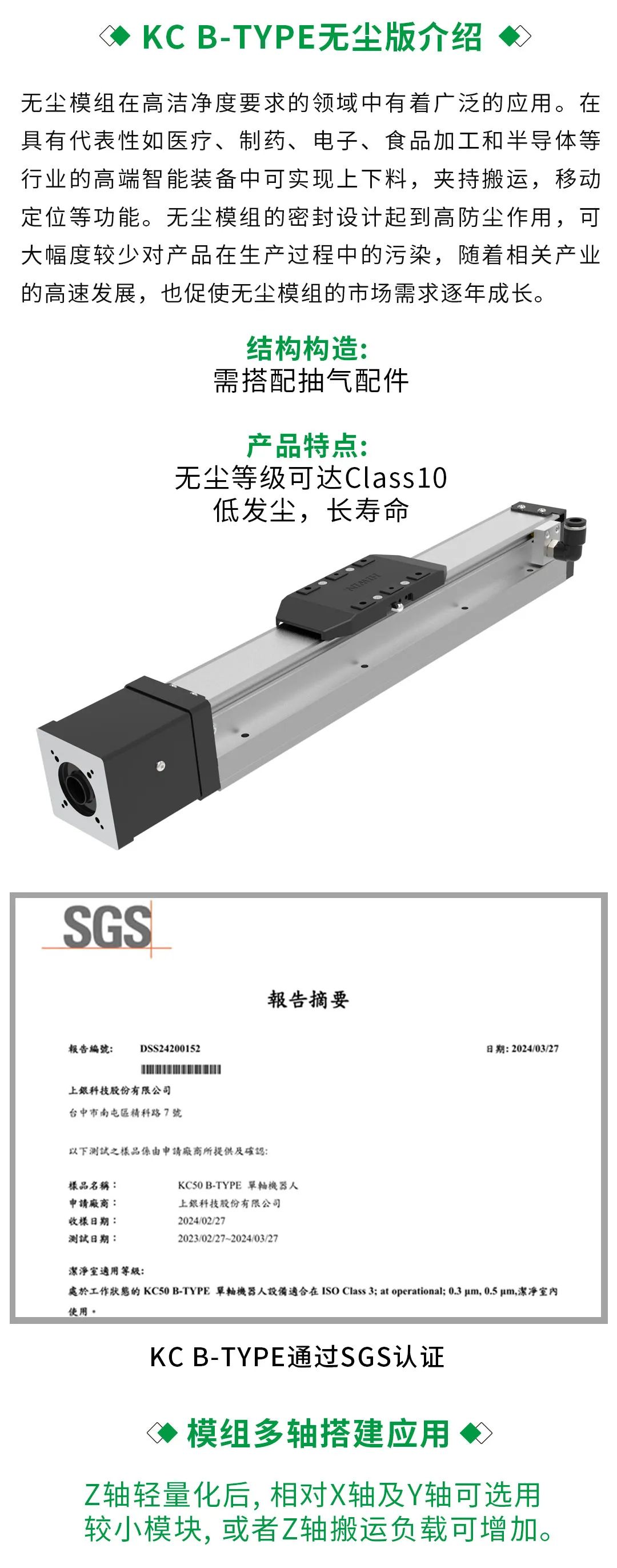 在运动性能方面,KC - B Type展现出高精度的特点。它能够精准地完成各种单轴方向的移动任务,定位精度达到了行业内较为先进的水平。这一特性对于需要精确操作的生产工序,例如在半导体芯片制造过程中的晶圆搬运环节,至关重要。