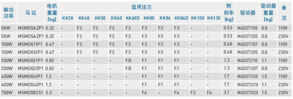 单轴机器人:适用电机对照表-松下 Panasonic 伺服电机、安川 Yaskawa 伺服电机